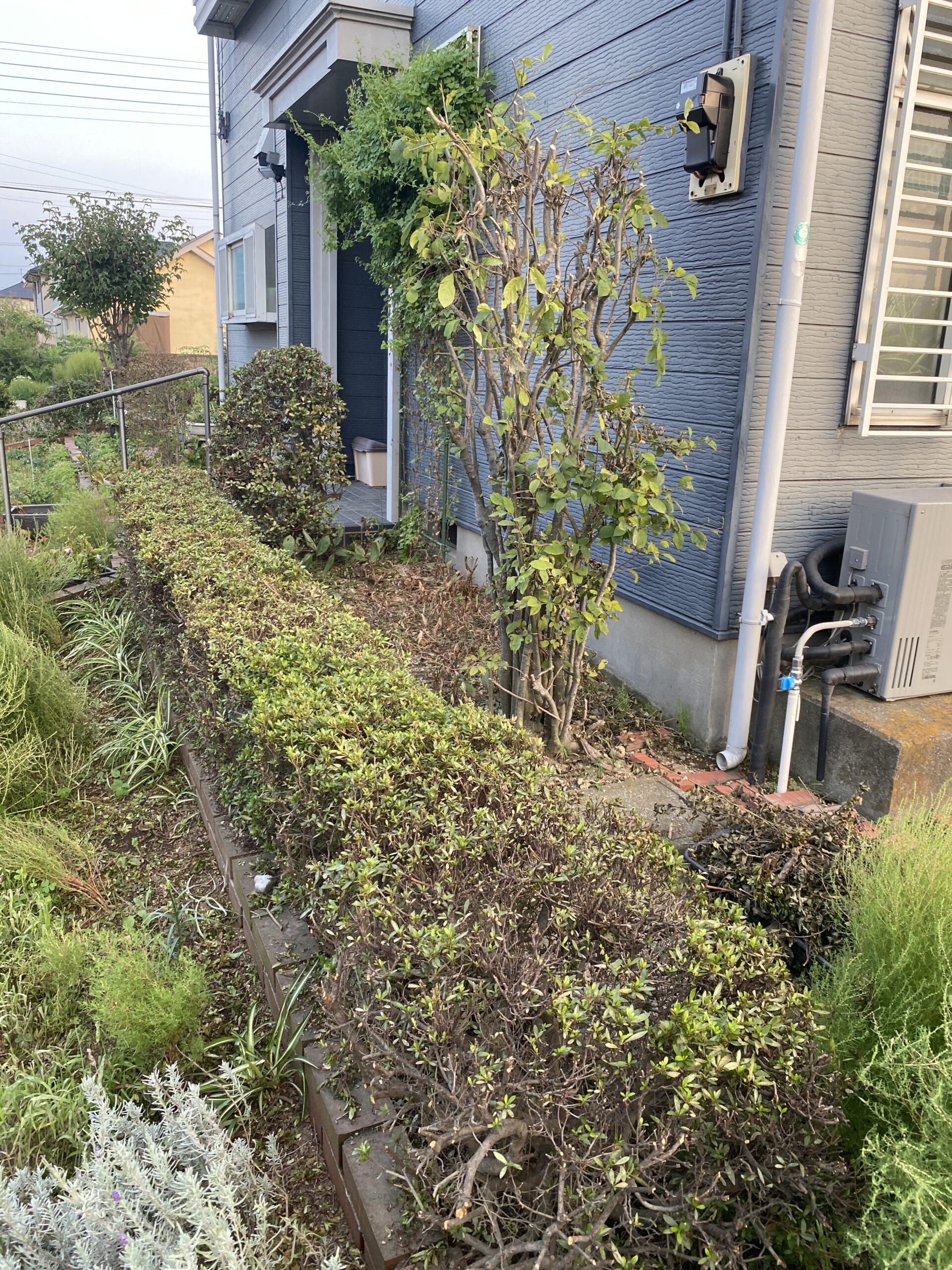 玄関先の低木を角刈りにし始める。